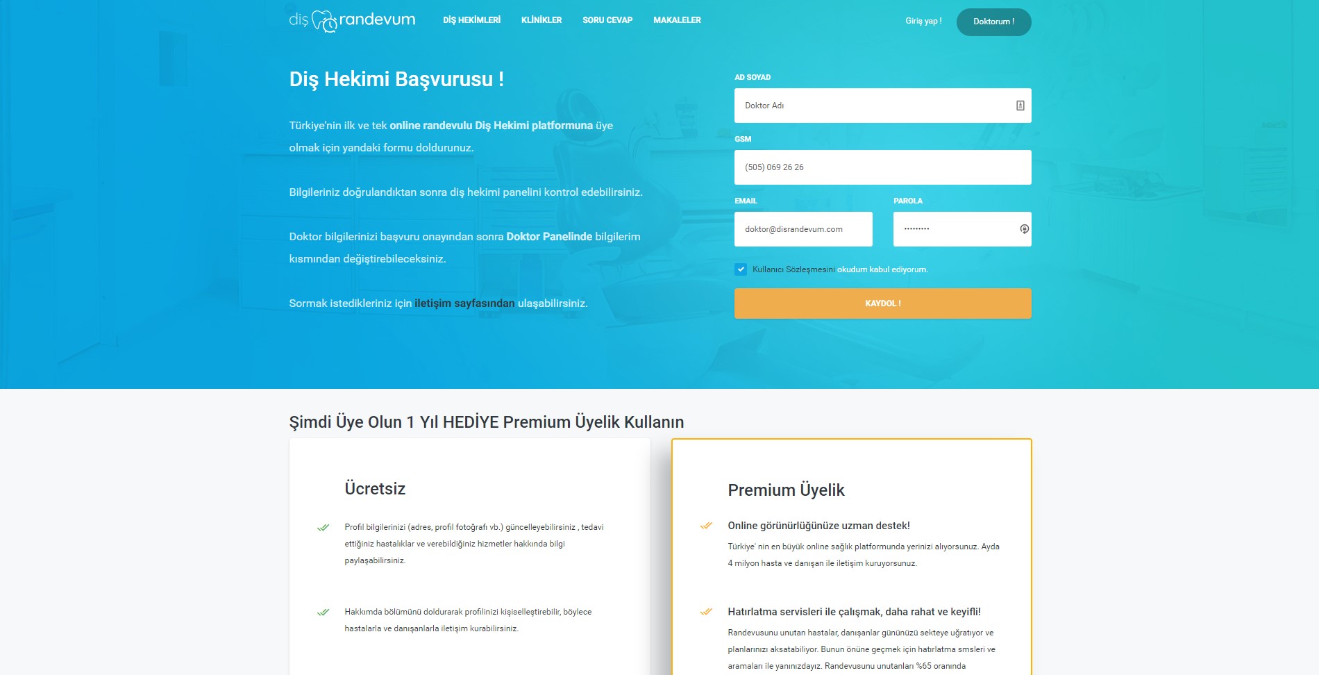 Öncelikle arama alanından adınızı aradığınızda sistemde kaydı olmadığından emin olun. Site üzerinden sağ üstte yer alan "Diş Hekimi Kaydı Yap" linkine tıklanır.