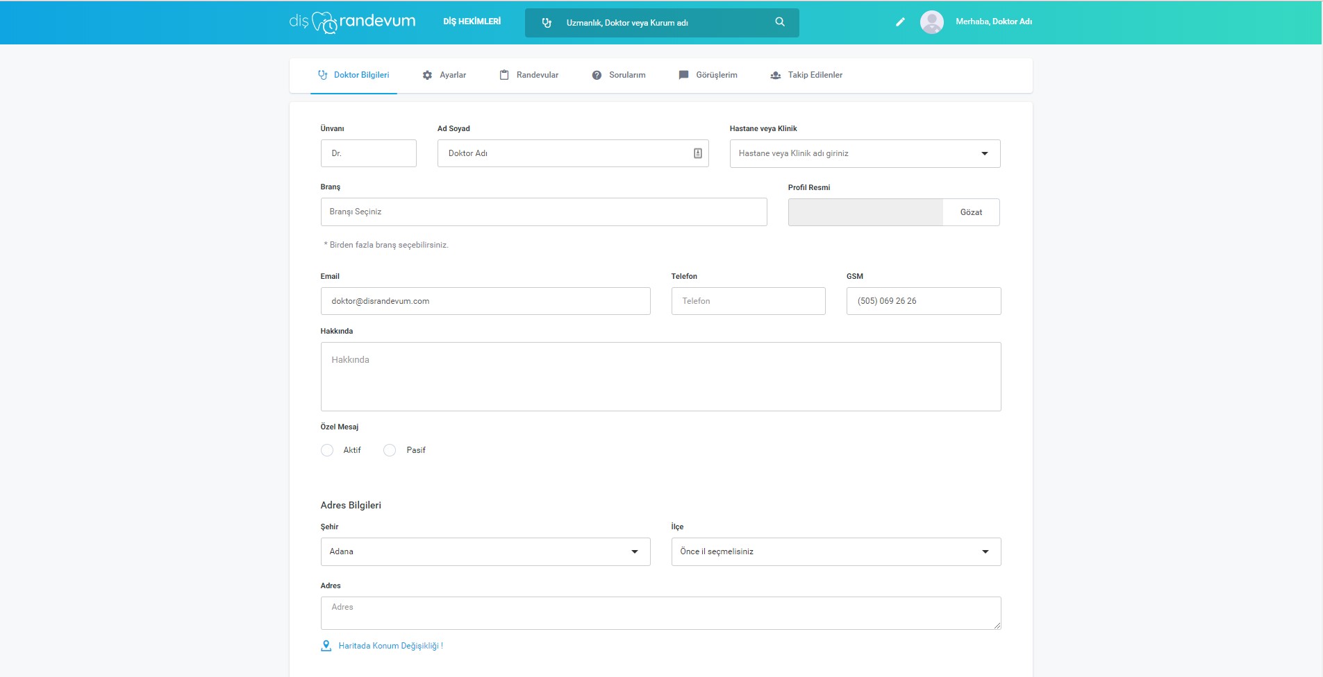 Kaydınız yapılarak bilgilerinizi gireceğiniz sayfaya yönleneceksiniz. Bu sayfada profil fotoğrafınız, klinik, uzmanlık alanı, adres, telefon vb. bilgilerinizi girebilirsiniz.