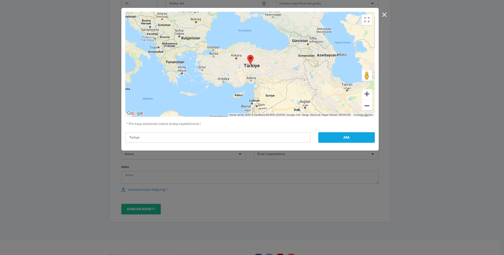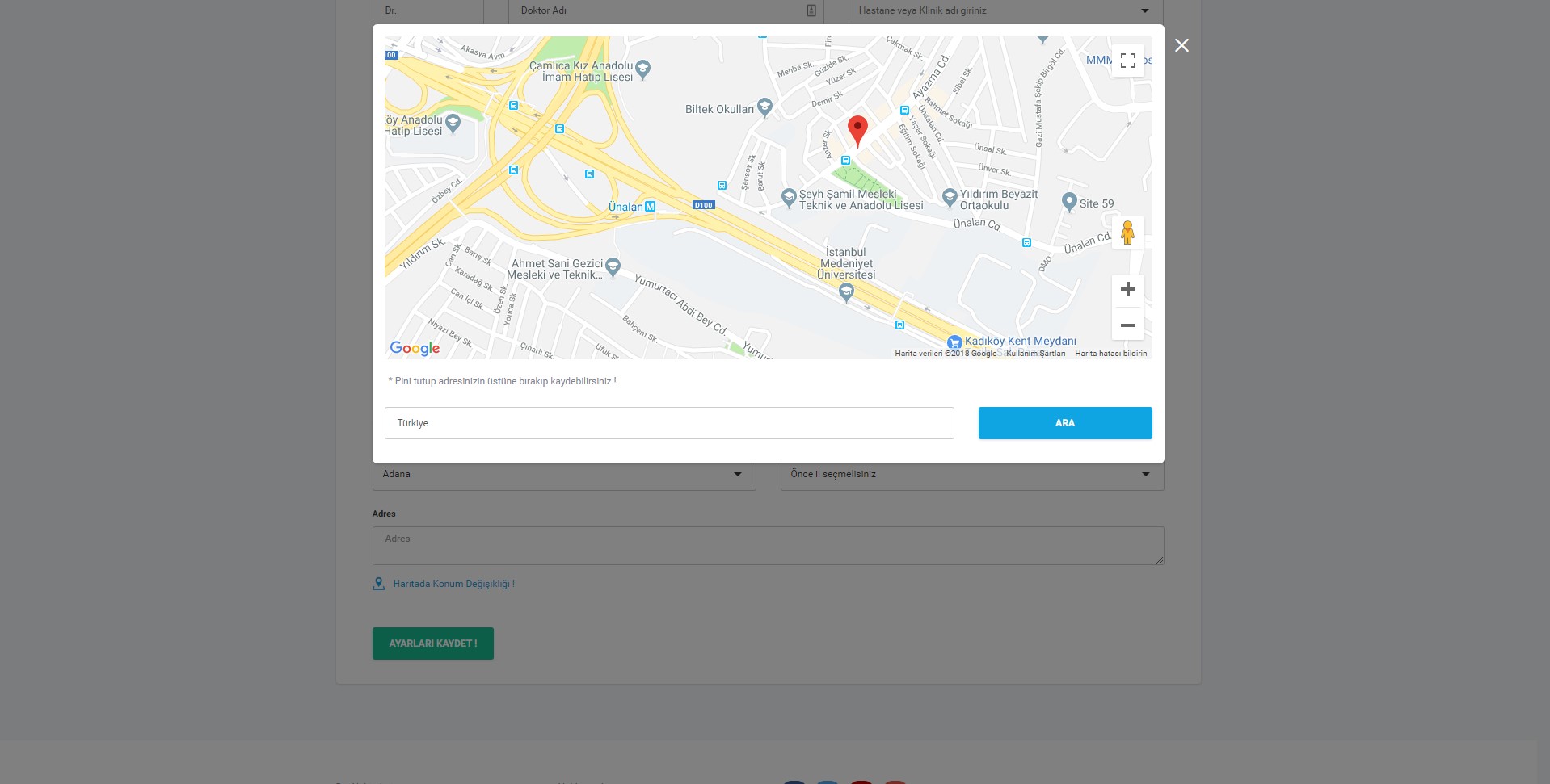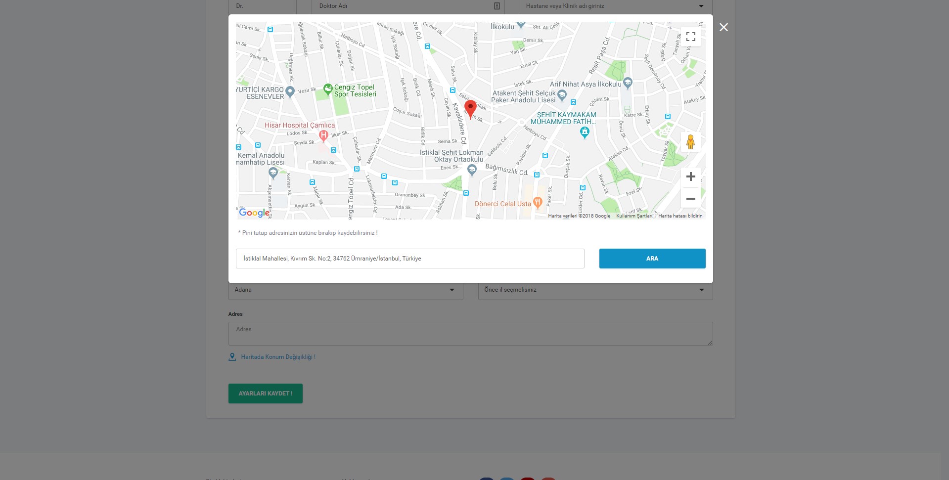Harita sayfasında adres kısmına adresinizi yazarak "ARA" butonuna tıklayarak ta konum seçimi yapılabilmektedir. Adres arama ile büyük oranda doğru konum seçilmesine karşılık hata olması durumunda baloncuğu tutup taşıyarak (mause/fare ile sol buton ile tutup taşıma) doğru konuma getirebilirsiniz. Haritayı kaydetmek için harita dışındaki grimsi alana tıklamanız yeterli olacaktır.